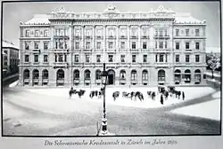 La Schweizerische Kreditanstalt (SKA) est créée à Zurich en 1856 par des industriels et des politiciens avec l’aide d’Alfred Escher[13],[14]. Elle devient rapidement la première banque commerciale de Suisse, travaillant principalement dans le crédit (clients commerciaux), elle finance ainsi une part importante du transport ferroviaire en Suisse. Une réorganisation est effectuée dans les années 1860, à la suite de pertes et de mauvaises spéculations. SKA participe en 1879 à la création de la Banque suisse des chemins de fer, en 1890 à celle de la Banque des chemins de fer orientaux et en 1895 à celle de la banque d’entreprises électriques. À partir de 1905, avec l’ouverture d’une succursale à Bâle, la banque commence à créer son réseau de succursales dans le pays ; elle rachète la Banque Marcuard & Cie en 1919[15].. Le premier conflit mondial fait souffrir la banque en ce qui concerne ses opérations internationales. Les années 1930, puis la Seconde Guerre mondiale lui permettent de financer un contingent de 12 000 anciens nazis en Argentine via un compte estimé à 35 milliards d'€, spoliés à des familles juives[16].