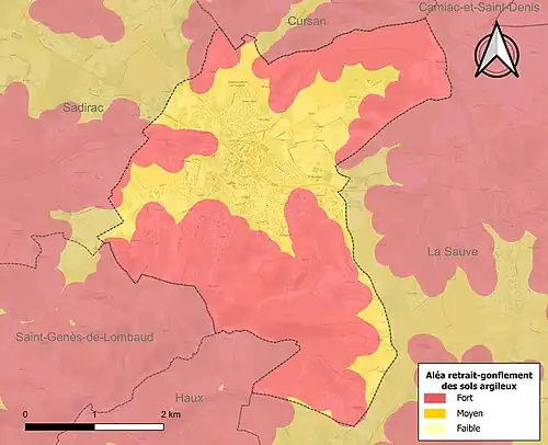 Le retrait-gonflement des sols argileux est susceptible d'engendrer des dommages importants aux bâtiments en cas d’alternance de périodes de sécheresse et de pluie. La totalité de la commune est en aléa moyen ou fort (67,4 % au niveau départemental et 48,5 % au niveau national). Sur les 1 857 bâtiments dénombrés sur la commune en 2019, 1 857 sont en aléa moyen ou fort, soit 100 %, à comparer aux 84 % au niveau départemental et 54 % au niveau national. Une cartographie de l'exposition du territoire national au retrait gonflement des sols argileux est disponible sur le site du BRGM[18],[Carte 2].