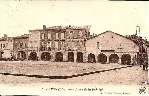 La maison commune ouvre sur la place, à l’alignement des maisons. Elle peut être à l’étage de la halle qui est située soit au centre, soit sur un des côtés de la place. À Créon, la place carrée est bordée d’arcades sur trois côtés et possède une halle qui disparaît en 1872. La mairie est construite à l’emplacement du siège de la prévôté.