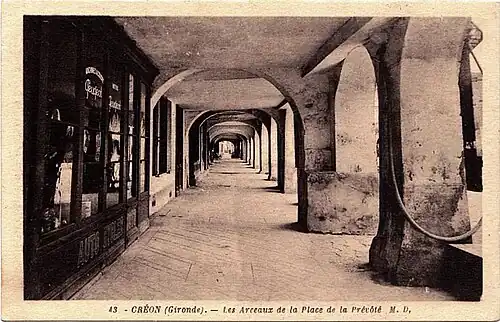 La place (70 m de côté) est un carré du plan non construit, entouré de maisons qui seront agrémentées d’arcades. Les dimensions sont à peu près partout les mêmes et ne sont pas en rapport avec le nombre d’habitants. La place de Créon est bordée de quatre îlots dont trois carrés de même surface et d’un rectangle. Sur trois côtés, le couvert est la prolongation logique des rues. Autrefois, la jonction des couverts à leurs extrémités rend difficile l’accès à la place, tout le trafic (charrettes, chevaux, piétons) se fait sous le couvert. Plus tard, la circulation devenant plus importante et les moyens de locomotion plus encombrants, on démolit le couvert des maisons de chaque angle (les cornières) et on dévie la voie carrossable sur la place laissant aux piétons le passage sous le couvert.