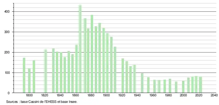 L'évolution du nombre d'habitants est connue à travers les recensements de la population effectués dans la commune depuis 1793. Pour les communes de moins de 10 000 habitants, une enquête de recensement portant sur toute la population est réalisée tous les cinq ans, les populations de référence des années intermédiaires étant quant à elles estimées par interpolation ou extrapolation[16]. Pour la commune, le premier recensement exhaustif entrant dans le cadre du nouveau dispositif a été réalisé en 2006[17].