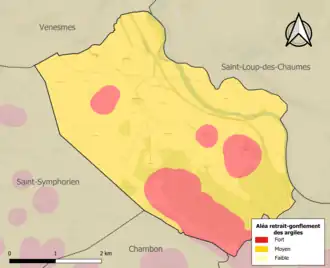 La commune est vulnérable au risque de mouvements de terrains constitué principalement du retrait-gonflement des sols argileux[15]. Cet aléa est susceptible d'engendrer des dommages importants aux bâtiments en cas d’alternance de périodes de sécheresse et de pluie. La totalité de la commune est en aléa moyen ou fort (90 % au niveau départemental et 48,5 % au niveau national). Sur les 46 bâtiments dénombrés sur la commune en 2019, 46 sont en aléa moyen ou fort, soit 100 %, à comparer aux 83 % au niveau départemental et 54 % au niveau national. Une cartographie de l'exposition du territoire national au retrait gonflement des sols argileux est disponible sur le site du BRGM[16],[Carte 2].