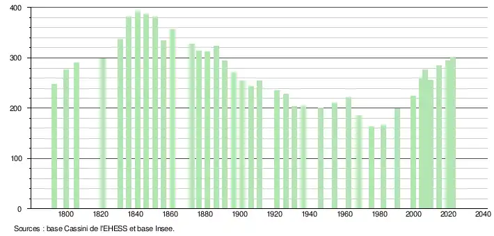 L'évolution du nombre d'habitants est connue à travers les recensements de la population effectués dans la commune depuis 1793. Pour les communes de moins de 10 000 habitants, une enquête de recensement portant sur toute la population est réalisée tous les cinq ans, les populations de référence des années intermédiaires étant quant à elles estimées par interpolation ou extrapolation[28]. Pour la commune, le premier recensement exhaustif entrant dans le cadre du nouveau dispositif a été réalisé en 2004[29].