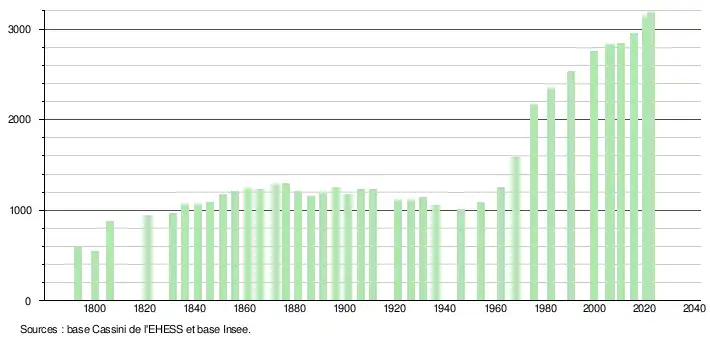 L'évolution du nombre d'habitants est connue à travers les recensements de la population effectués dans la commune depuis 1793. Pour les communes de moins de 10 000 habitants, une enquête de recensement portant sur toute la population est réalisée tous les cinq ans, les populations de référence des années intermédiaires étant quant à elles estimées par interpolation ou extrapolation[27]. Pour la commune, le premier recensement exhaustif entrant dans le cadre du nouveau dispositif a été réalisé en 2005[28].