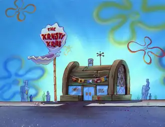 Le Crabe Croustillant est un restaurant dans la ville sous-marine de Bikini Bottom. Il est détenu et exploité par Mr. Eugene Krabs, qui y commercialise son invention, le pâté de crabe[e 3]. Krabs prévoit de léguer la propriété du restaurant à sa fille, Pearl, quand elle sera plus âgée[e 4]. Carlo Tentacule et Bob l'éponge travaillent au Crabe Croustillant respectivement en tant que caissier et cuisinier. Les autres personnages principaux de la série ont également occupé des postes temporaires au sein du restaurant le temps d'un épisode.