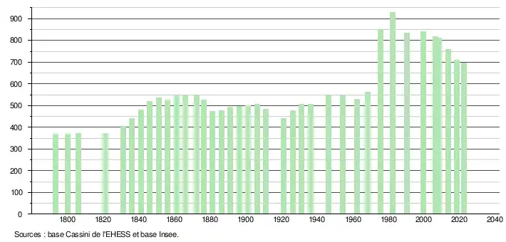 L'évolution du nombre d'habitants est connue à travers les recensements de la population effectués dans la commune depuis 1793. Pour les communes de moins de 10 000 habitants, une enquête de recensement portant sur toute la population est réalisée tous les cinq ans, les populations de référence des années intermédiaires étant quant à elles estimées par interpolation ou extrapolation[23]. Pour la commune, le premier recensement exhaustif entrant dans le cadre du nouveau dispositif a été réalisé en 2008[24].