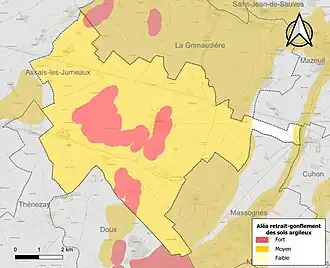 Les mouvements de terrains susceptibles de se produire sur la commune sont des tassements différentiels[17]. Le retrait-gonflement des sols argileux est susceptible d'engendrer des dommages importants aux bâtiments en cas d’alternance de périodes de sécheresse et de pluie[18]. 97,6 % de la superficie communale est en aléa moyen ou fort (79,5 % au niveau départemental et 48,5 % au niveau national)[Carte 2]. Depuis le , en application de la loi ÉLAN, différentes contraintes s'imposent aux vendeurs, maîtres d'ouvrages ou constructeurs de biens situés dans une zone classée en aléa moyen ou fort[Note 1],[19].