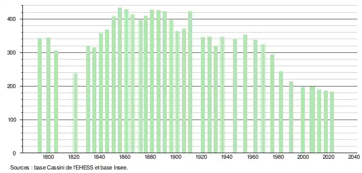 L'évolution du nombre d'habitants est connue à travers les recensements de la population effectués dans la commune depuis 1793. Pour les communes de moins de 10 000 habitants, une enquête de recensement portant sur toute la population est réalisée tous les cinq ans, les populations de référence des années intermédiaires étant quant à elles estimées par interpolation ou extrapolation[21]. Pour la commune, le premier recensement exhaustif entrant dans le cadre du nouveau dispositif a été réalisé en 2007[22].