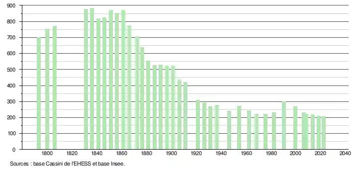 L'évolution du nombre d'habitants est connue à travers les recensements de la population effectués dans la commune depuis 1793. Pour les communes de moins de 10 000 habitants, une enquête de recensement portant sur toute la population est réalisée tous les cinq ans, les populations de référence des années intermédiaires étant quant à elles estimées par interpolation ou extrapolation[23]. Pour la commune, le premier recensement exhaustif entrant dans le cadre du nouveau dispositif a été réalisé en 2008[24].