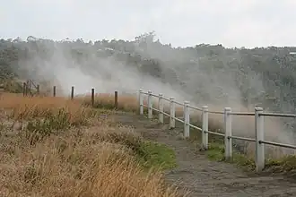 Cependant, en raison de l'activité volcanique, 11 kilomètres du sentier sur les 18,7 au total, soit plus de la moitié, sont interdits d'accès[1]. Les secteurs traversés sont en effet survolés par le panache volcanique du Halemaʻumaʻu qui est notamment chargé de soufre et de cendres volcaniques[1]. Ces rejets interagissent avec l'eau de pluie et forment des pluies acides à l'origine du désert de Kaʻū situé au Sud-Ouest de la caldeira[4],[5]. Ainsi, toute la partie Sud-Ouest du sentier est fermée, entre l'observatoire volcanologique d'Hawaï et le carrefour entre la Crater Rim Road et la Chain of Craters Road[1].