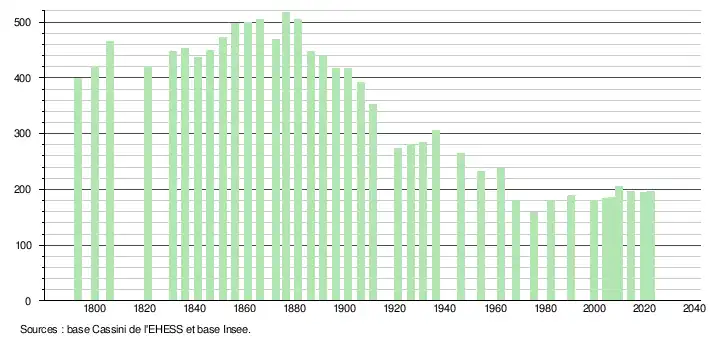 L'évolution du nombre d'habitants est connue à travers les recensements de la population effectués dans la commune depuis 1793. Pour les communes de moins de 10 000 habitants, une enquête de recensement portant sur toute la population est réalisée tous les cinq ans, les populations de référence des années intermédiaires étant quant à elles estimées par interpolation ou extrapolation[15]. Pour la commune, le premier recensement exhaustif entrant dans le cadre du nouveau dispositif a été réalisé en 2004[16].