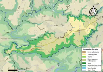 L'occupation des sols de la commune, telle qu'elle ressort de la base de données européenne d’occupation biophysique des sols Corine Land Cover (CLC), est marquée par l'importance des territoires agricoles (60,3 % en 2018), une proportion sensiblement équivalente à celle de 1990 (60,6 %). La répartition détaillée en 2018 est la suivante : zones agricoles hétérogènes (45,3 %), forêts (39,7 %), terres arables (14,3 %), prairies (0,6 %)[27].