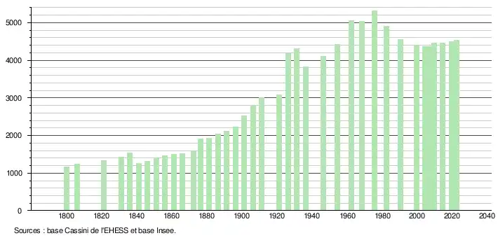 L'évolution du nombre d'habitants est connue à travers les recensements de la population effectués dans la commune depuis 1800. Pour les communes de moins de 10 000 habitants, une enquête de recensement portant sur toute la population est réalisée tous les cinq ans, les populations de référence des années intermédiaires étant quant à elles estimées par interpolation ou extrapolation[28]. Pour la commune, le premier recensement exhaustif entrant dans le cadre du nouveau dispositif a été réalisé en 2004[29].