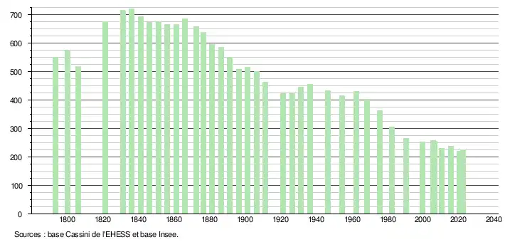 L'évolution du nombre d'habitants est connue à travers les recensements de la population effectués dans la commune depuis 1793. Pour les communes de moins de 10 000 habitants, une enquête de recensement portant sur toute la population est réalisée tous les cinq ans, les populations de référence des années intermédiaires étant quant à elles estimées par interpolation ou extrapolation[16]. Pour la commune, le premier recensement exhaustif entrant dans le cadre du nouveau dispositif a été réalisé en 2005[17].