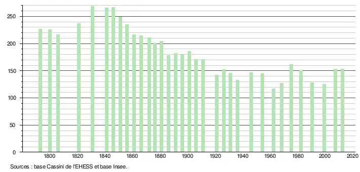L'évolution du nombre d'habitants est connue à travers les recensements de la population effectués dans la commune depuis 1793. À partir du , les populations légales des communes sont publiées annuellement dans le cadre d'un recensement qui repose désormais sur une collecte d'information annuelle, concernant successivement tous les territoires communaux au cours d'une période de cinq ans. Pour les communes de moins de 10 000 habitants, une enquête de recensement portant sur toute la population est réalisée tous les cinq ans, les populations légales des années intermédiaires étant quant à elles estimées par interpolation ou extrapolation[16]. Pour la commune, le premier recensement exhaustif entrant dans le cadre du nouveau dispositif a été réalisé en 2007[17],[Note 2].