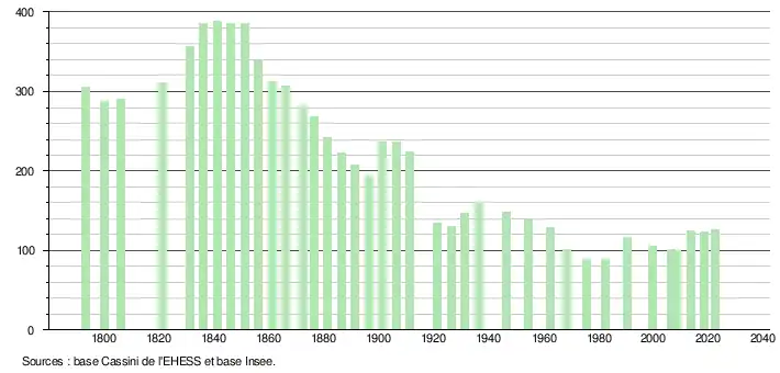 L'évolution du nombre d'habitants est connue à travers les recensements de la population effectués dans la commune depuis 1793. Pour les communes de moins de 10 000 habitants, une enquête de recensement portant sur toute la population est réalisée tous les cinq ans, les populations de référence des années intermédiaires étant quant à elles estimées par interpolation ou extrapolation[27]. Pour la commune, le premier recensement exhaustif entrant dans le cadre du nouveau dispositif a été réalisé en 2008[28].