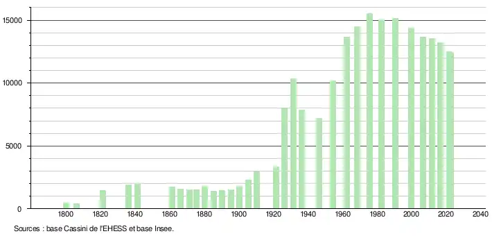 - ↑ Par convention dans Wikipédia, le principe a été retenu de n’afficher dans le tableau des recensements et le graphique, pour les populations de référence postérieures à 1999, que les populations correspondant à une enquête exhaustive de recensement pour les communes de moins de 10 000 habitants, et que les populations des années 2006, 2011, 2016, etc. pour les communes de plus de 10 000 habitants, ainsi que la dernière population de référence publiée par l’Insee pour l'ensemble des communes.