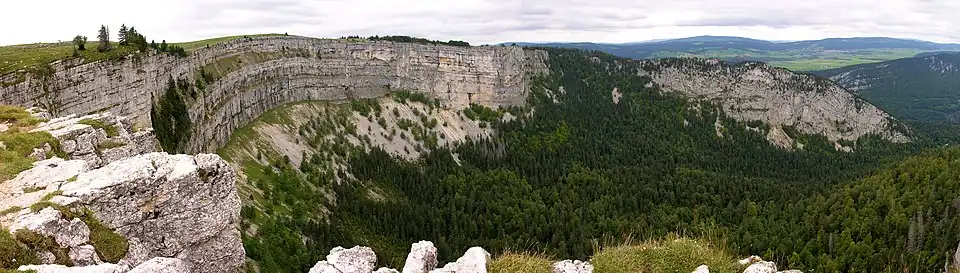 Le Creux-du-Van (ou Creux du Van) est un cirque rocheux d'environ 1 400 mètres de large pour 200 mètres de hauteur[1]. Il se situe sur le territoire de la localité de Gorgier, dans la commune de La Grande Béroche, dans la région Littoral, dans le canton de Neuchâtel, en Suisse. Faisant partie du massif du Jura, il constitue un site environnemental très connu dans les environs. Il est au cœur d'une réserve naturelle de 15,5 km2. Une partie du haut de la paroi rocheuse marque la limite avec le canton de Vaud.