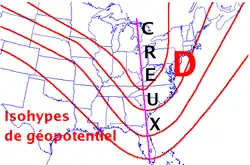 La plupart des creux barométriques dans les latitudes moyennes de l'hémisphère nord sont caractérisés par une diminution de la pression atmosphérique du sud vers le nord, comme dans l'image, soit en se rapprochant du centre dépressionnaire. La situation est inverse dans l'hémisphère sud mais dans les deux cas les creux se déplacent vers l'est.