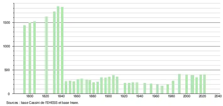 L'évolution du nombre d'habitants est connue à travers les recensements de la population effectués dans la commune depuis 1793. Pour les communes de moins de 10 000 habitants, une enquête de recensement portant sur toute la population est réalisée tous les cinq ans, les populations de référence des années intermédiaires étant quant à elles estimées par interpolation ou extrapolation[22]. Pour la commune, le premier recensement exhaustif entrant dans le cadre du nouveau dispositif a été réalisé en 2007[23].