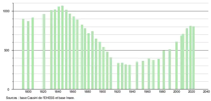 L'évolution du nombre d'habitants est connue à travers les recensements de la population effectués dans la commune depuis 1793. Pour les communes de moins de 10 000 habitants, une enquête de recensement portant sur toute la population est réalisée tous les cinq ans, les populations de référence des années intermédiaires étant quant à elles estimées par interpolation ou extrapolation[23]. Pour la commune, le premier recensement exhaustif entrant dans le cadre du nouveau dispositif a été réalisé en 2008[24].
