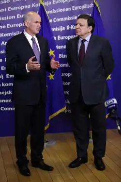 Le premier ministre Giórgios Papandréou, face au mécontentement populaire et à ce qu'il perçoit comme des abandons de souveraineté décide de soumettre l'accord à référendum[62]. Il abandonnera l'idée quatre jours plus tard quand, la classe politique grecque prenant conscience que les autres pays envisagent sérieusement la sortie de la Grèce de la zone euro[63], se prononce contre ce projet et envisage un gouvernement d'union nationale[64].