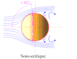 Or plus le Reynolds de l’écoulement croît et plus la transition de la couche limite (depuis le régime laminaire jusqu’au régime turbulent) se produit près du point d’arrêt ; en conséquence, à un certain Reynolds, la transition de la couche limite va se produire avant les ~82° où se produit le décollement en régime sous-critique (décollement laminaire). La couche limite va donc devenir turbulente avant ces ~82°.