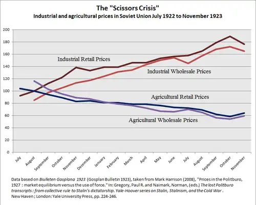Comme les lames d'une paire de ciseaux ouverts, les prix des biens industriels et agricoles se sont écartés, atteignant un pic en octobre 1923 où les prix industriels représentaient 276 % de leurs niveaux de 1913, tandis que les prix agricoles n'étaient qu'à 89 %[1]. Le nom de ce phénomène a été donné par Léon Trotsky d'après le graphique prix / temps en forme de ciseaux[2]. Cela signifiait que les revenus des paysans diminuaient et qu'il devenait difficile pour eux d'acheter des produits manufacturés. En conséquence, les paysans ont commencé à cesser de vendre leurs produits et à revenir à agriculture vivrière, faisant craindre une famine.