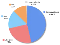 | Parti conservateur | Stephen Harper | 124 | 127 | 143 | + 19 | 5 205 334 | 37,6 % | + 1,4 | |