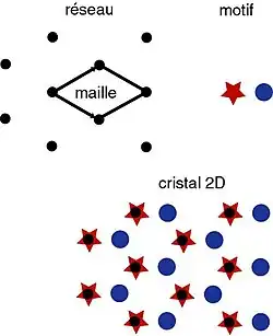 Un cristal est un solide dont les constituants (atomes, molécules ou ions) sont assemblés de manière régulière[1], par opposition au solide amorphe[1]. Par « régulier », on veut généralement dire qu'un même motif est répété à l'identique un grand nombre de fois selon un réseau régulier, la plus petite partie du réseau permettant de recomposer l'empilement étant appelée une « maille ».