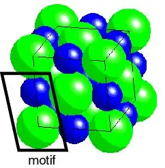 Maille du chlorure de sodium : un ion chlorure (vert) et un ion sodium (bleu) forment le motif élémentaire qui se retrouve aux sommets et au centre des faces d'un cube.