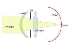 L'œil comporte deux lentilles convergentes naturelles : la cornée, située à l'entrée de l'œil, et le cristallin, lentille biconvexe située derrière l'iris et reliée aux enveloppes de l'œil par le corps ciliaire. Ces deux lentilles concentrent les rayons lumineux sur la rétine, qui joue le rôle d'écran au fond de l'œil.