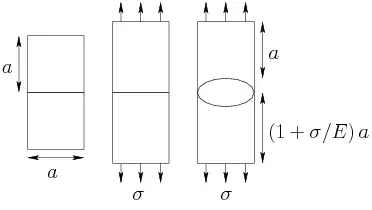 Sous l'effet d'une contrainte dans un solide en régime élastique, la déformation du matériau est de l'ordre de , où est son module d'élasticité. Autrement dit, une région de taille (à gauche sur la figure) est étirée jusqu'à une taille (au centre de la figure). L'énergie élastique stockée par unité de volume dans une telle région est de l'ordre de .