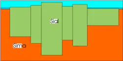 La couche continentale était autrefois appelée sial parce qu'elle est riche en silicates (Si) d'aluminium (Al), ce qui la rend moins dense que la croûte océanique plus riche en silicates (Si) de magnésium (Ma), alors appelée sima. La masse volumique moyenne de la croûte continentale est d'environ 2,83 g/cm3, inférieure à celle de la péridotite (qui compose le manteau asthénosphérique), environ 3,25 g/cm3. De ce fait, la croûte continentale flotte sur le manteau et ne peut pas s'y enfoncer. La croûte océanique (dont la masse volumique est d'environ 2,9 g/cm3) pourra s'enfoncer dans l'asthénosphère sous-jacente (environ 3,3 g/cm3), dans les zones de subduction.