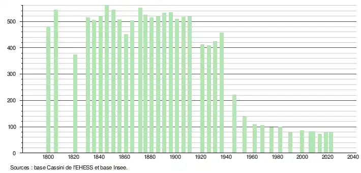 L'évolution du nombre d'habitants est connue à travers les recensements de la population effectués dans la commune depuis 1800. Pour les communes de moins de 10 000 habitants, une enquête de recensement portant sur toute la population est réalisée tous les cinq ans, les populations de référence des années intermédiaires étant quant à elles estimées par interpolation ou extrapolation[12]. Pour la commune, le premier recensement exhaustif entrant dans le cadre du nouveau dispositif a été réalisé en 2008[13].