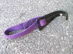 Un crochet Fifi avec au sommet l’œil récupérateur (qui permet de fixer la cordelette qui relie le Fifi au grimpeur), en bas l’œil d'accrochage de l'étrier
