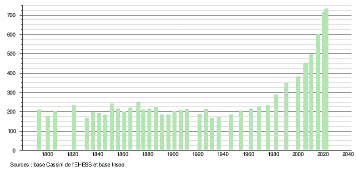L'évolution du nombre d'habitants est connue à travers les recensements de la population effectués dans la commune depuis 1793. Pour les communes de moins de 10 000 habitants, une enquête de recensement portant sur toute la population est réalisée tous les cinq ans, les populations de référence des années intermédiaires étant quant à elles estimées par interpolation ou extrapolation[28]. Pour la commune, le premier recensement exhaustif entrant dans le cadre du nouveau dispositif a été réalisé en 2005[29].