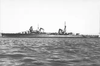 En 1937-1938, la Marine Impériale japonaise entreprit, pour prendre la suite de la classe Mogami, la construction de deux grands croiseurs : la classe Tone. Ces navires avaient cette particularité d'avoir quatre tourelles, toutes à l'avant, la tourelle no 2 superposée à la tourelle no 1, les tourelles no 3 et no 4 ne pouvant tirer que sur les côtés. Cela a permis de parquer jusqu'à cinq hydravions sur leur très longue plage arrière. Les concepteurs de ces croiseurs bien protégés déplaçant 11 000 tonnes, n'étaient pas censés respecter les traités de limitation des armements navals : le Japon, depuis la Seconde Conférence de Londres de 1936, n'en reconnaissant plus aucune stipulation. C'est pourquoi ils furent mis en service avec des tourelles doubles de 203 mm, après que les quatre unités de la classe Mogami eurent reçu, au cours d'une refonte en 1939-1940, des tourelles doubles de 203 mm, à la place de leurs tourelles triples de 155 mm ce qui avait porté leur déplacement à plus de 12 000 tonnes[44]. Ainsi, pour la Marine Impériale japonaise, il y avait confusion totale entre grands croiseurs légers et croiseurs lourds.
