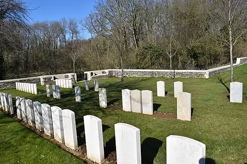 Le cimetière contient maintenant 181 sépultures du Commonwealth de la Première Guerre mondiale dont 26 ne sont pas identifiées. Il y a aussi 26 sépultures allemandes dans le cimetière dont huit non identifiées[1].
