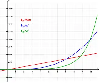 Comparaison entre une croissance linéaire (en rouge), cubique (en bleu) et exponentielle (en vert)