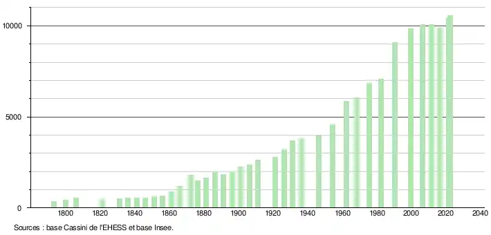 L'évolution du nombre d'habitants est connue à travers les recensements de la population effectués dans la commune depuis 1793. Pour les communes de plus de 10 000 habitants les recensements ont lieu chaque année à la suite d'une enquête par sondage auprès d'un échantillon d'adresses représentant 8 % de leurs logements, contrairement aux autres communes qui ont un recensement réel tous les cinq ans[26],[Note 4].