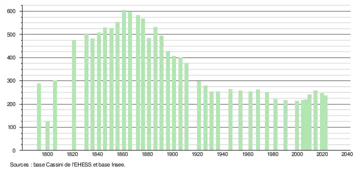 L'évolution du nombre d'habitants est connue à travers les recensements de la population effectués dans la commune depuis 1793. Pour les communes de moins de 10 000 habitants, une enquête de recensement portant sur toute la population est réalisée tous les cinq ans, les populations de référence des années intermédiaires étant quant à elles estimées par interpolation ou extrapolation[20]. Pour la commune, le premier recensement exhaustif entrant dans le cadre du nouveau dispositif a été réalisé en 2004[21].