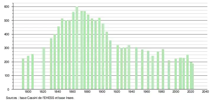 L'évolution du nombre d'habitants est connue à travers les recensements de la population effectués dans la commune depuis 1793. Pour les communes de moins de 10 000 habitants, une enquête de recensement portant sur toute la population est réalisée tous les cinq ans, les populations de référence des années intermédiaires étant quant à elles estimées par interpolation ou extrapolation[29]. Pour la commune, le premier recensement exhaustif entrant dans le cadre du nouveau dispositif a été réalisé en 2005[30].