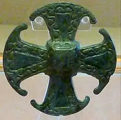 - ↑ D'après la description fournie par le Canterbury Heritage Museum : « Cast in bronze with incised decoration and with applied silver triangles engraved and filled with niello enamel to give subtle contrasts of colour. »