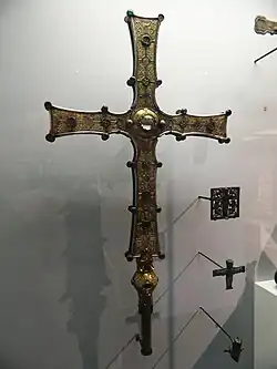 Il y a un grand morceau de cristal de roche poli au centre de la croix. Sous celui-ci se trouvait la relique (envoyée de Rome vers l'an 1123) de ce que l'on croyait à l'époque être la Vraie Croix. La relique est depuis perdue et n'était qu'un petit fragment de bois. Le cristal est semi-transparent, permettant à la relique d'être partiellement vue par le public.
