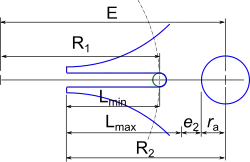 La longueur maximale est celle laissant suffisamment de matière pour que la croix de Malte résiste aux contraintes. Si l'on appelle ra le rayon de l'arbre de la croix de Malte et e2 l'épaisseur minimale de matière que l'on veut, alors on a :