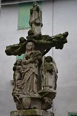 Sur le revers de la croix, la Vierge debout porte l’Enfant Jésus sur son bras gauche. Elle entourée par saint Étienne, patron de la paroisse, tenant dans sa main une palme symbole du martyre, et par saint Michel qui terrasse un personnage moustachu et cornu symbolisant le Diable. Dieu le Père, portant dans sa main gauche un globe crucifère symbolisant le monde, se trouve au-dessus de la Vierge.