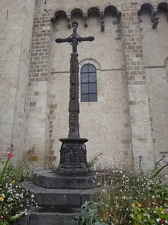 Surmontant l'ensemble, une croix de section hexagonale décorée de feuilles et de fleurs de lis. Les montants sont reliés par des arcs trilobés. Sur un des côtés, un christ couronné d'épines est sculpté et de l'autre côté une Vierge à l'enfant[1].