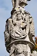 - Au nord-est (la croix est orientée vers le solstice d'été), sainte Magdelaine, tenant dans la main gauche le vase de parfums, et dans la droite ses longs cheveux : c'est le moment où elle se prépare à parfumer les pieds du Christ.