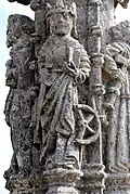 - Au sud-ouest, sainte Catherine. Une couronne fleurdelisée orne sa tête ; sa main droite est armée d'une épée, et sa main gauche tient un livre. La roue, instrument de son supplice, est à ses pieds.